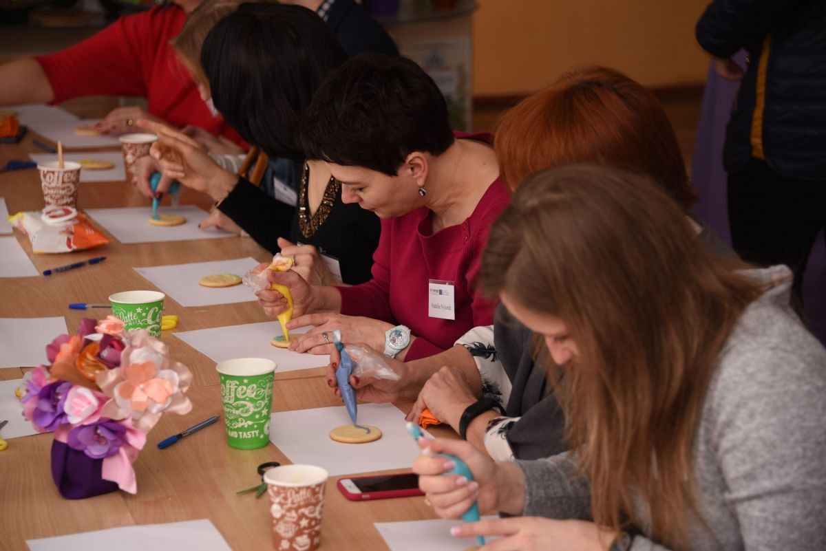 Згодом, гості мали змогу ознайомитись із ресурсами в бібліотечному середовищі та взяти участь у майстер-класі «Арт food-relax» (Смак емоцій), який проводили викладачі кафедри менеджменту освіти і практичної психології Наталія Бочаріна та Світлана Бєлякова. Учасники опанували відповідну техніку з розпису пряників; кожен з них розмалював декілька смаколиків, якими можна було б поласувати за горнятком запашної кави.