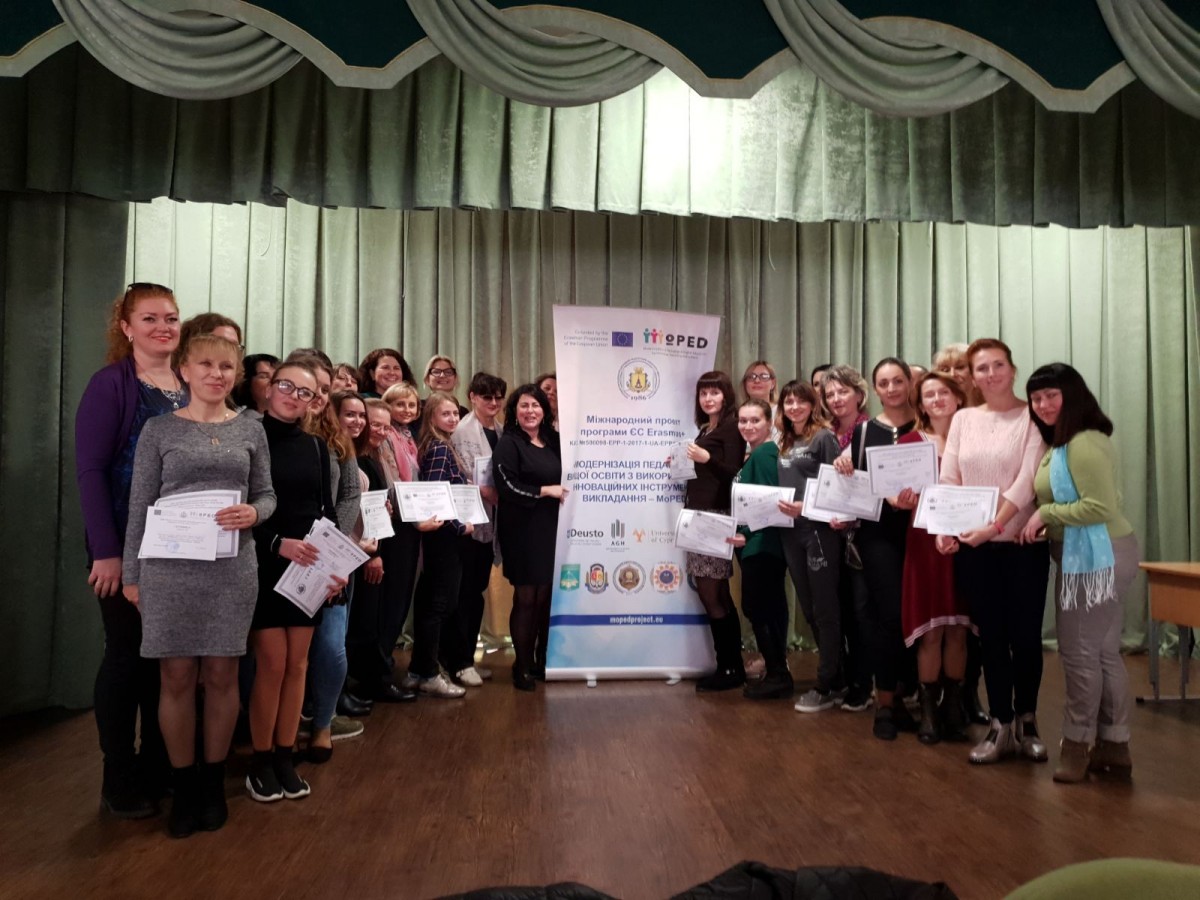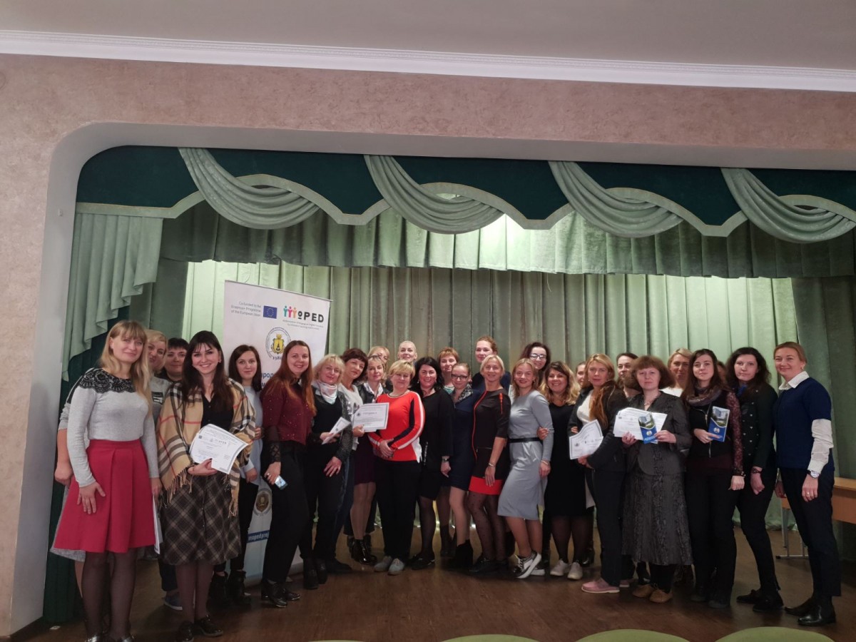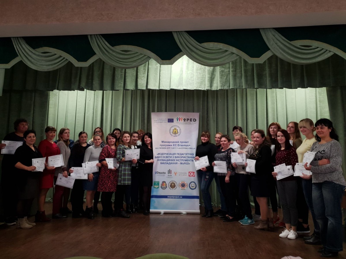 Керівник Відділу міжнародних відносин ДВНЗ «Переяслав-Хмельницький державний педагогічний університет імені Григорія Сковороди» Оксана Ковтун запросила всіх охочих до співпраці в рамках міжнародного проекту програми ЄС Erasmus + KA2 № 586098-EPP-1-2017-1-UA-EPPKA2-CBHE-JP «Модернізація педагогічної вищої освіти засобом використання інноваційних інструментів викладання – MoPED», презентувала усім учасникам конференції проект «Модернізація педагогічної вищої освіти з використанням інноваційних інструментів викладання – MoPED» – цикл навчальних тренінгів і семінарів, спрямованих на вдосконалення цифрової й дидактичної компетентностей викладачів закладів вищої освіти та учасників проекту.